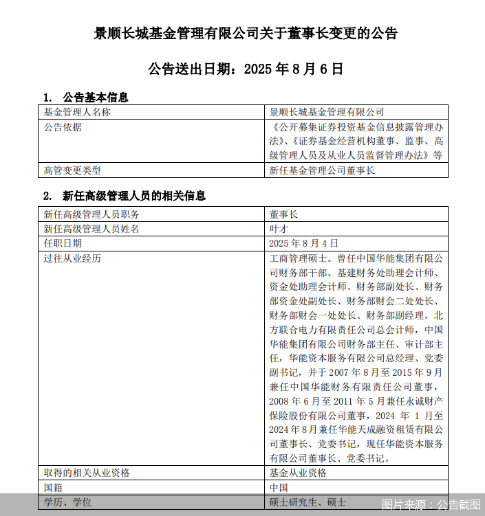 8月6日,景顺长城基金发布公告称,叶才自8月4日起任公司董事长。公开资料显示,叶才曾在中国华能集团有限公司、北方联合电力有限责任公司、中国华能集团有限公司、华能资本服务有限公司、华能天成融资租赁有限公司任职,现任华能资本服务有限公司董事长、党委书记。(北京商报)